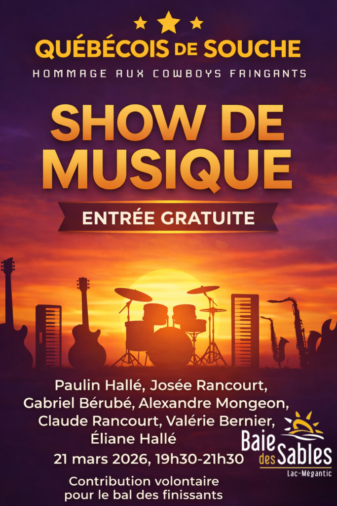 Le groupe Québécois de souches, composer d’artistes de la région, vous offre une soirée festive aux couleurs des Cowboys Fringants! Le tout se déroulera au chalet principal de la Station Baie-des-Sables!