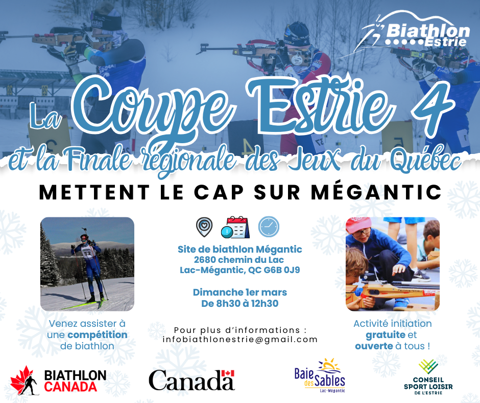 Venez vivre l'excitation de la Coupe Estrie 4 et de la Finale Régionale des Jeux du Québec d'Hiver 2024/2025 ! |