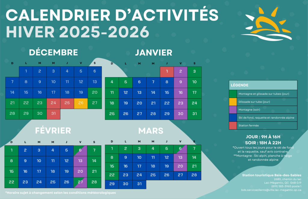Les périodes d’ouverture sont sujettes à modifications en lien avec la météo (pluie, froid extrême, etc.) et des accumulations de neige au sol.